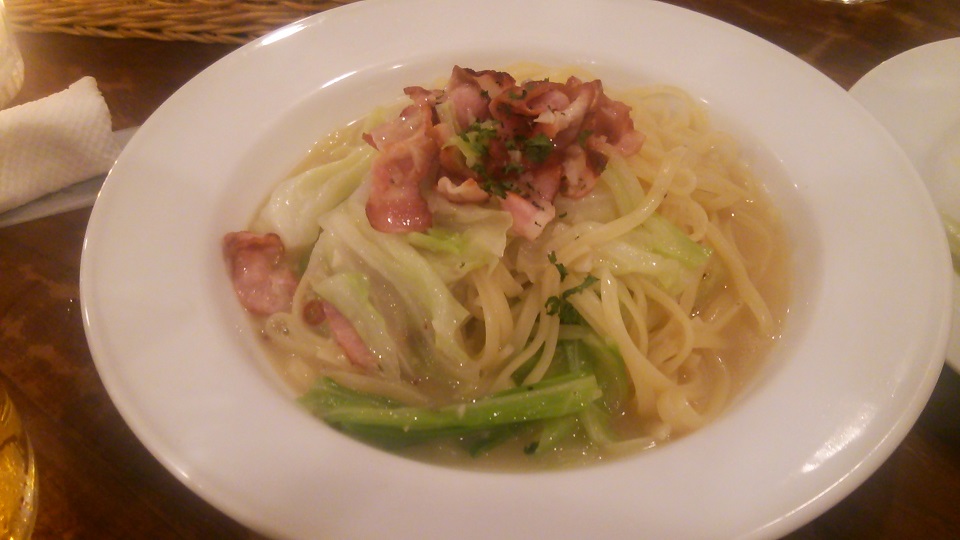 キャベツとベーコンのペペロンチーノ。